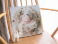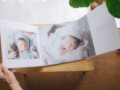 コロンとした正方形がかわいい絵本のような仕上がりです。そのまま飾ってもとっても可愛く、手に取りやすいアルバムです。表紙にクッションが入っておりソフトな触り心地で赤ちゃんのイメージにぴったりです。お名前、生まれた時の体重や身長などのバースデータが入ります。